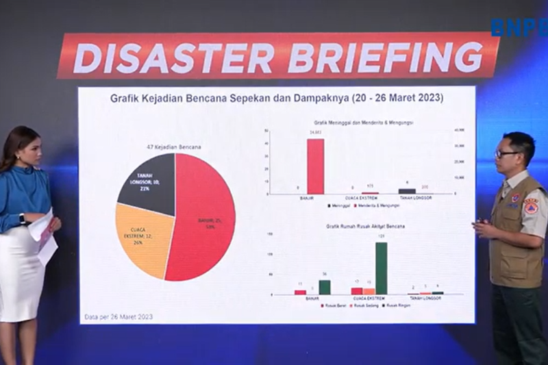Pelaksana tugas Kepala Pusat Data, Informasi dan Komunikasi Kebencanaan BNPB Abdul Muhari dalam disaster briefing yang diikuti daring di Jakarta, Selasa, mengatakan hal itu menjadi pertanda musim peralihan dengan adanya cuaca ekstrem, sehingga faktor tersebut mempengaruhi frekuensi kejadian bencana mingguan yang sudah mulai tampak surut pada 20-27 Maret 2023.