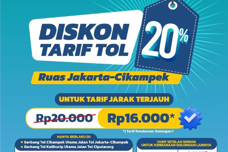 Besaran diskon tarif tol 20 persen untuk tarif terjauh Jalan Tol Jakarta-Cikampek adalah Kendaraan Golongan I semula Rp20.000 menjadi Rp16.000, diskon sebesar Rp4.000.