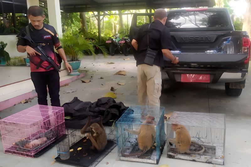 Dari tangan pelaku, tim mengamankan satwa liar dilindungi yang terdiri atas tiga ekor bekantan (Nasalis larvatus) dengan kondisi satu ekor dalam keadaan mati, serta dua ekor owa jenggot putih (Hylobates albibarbis).
